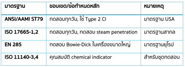 อุปกรณ์ทดสอบ: ต้องใช้ชุดทดสอบที่ผ่านการรับรองตามมาตรฐาน ISO 11140-4 หรือ EN 285
