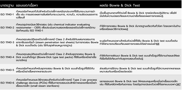 มาตรฐาน ISO 11140 ชุดนี้เป็นมาตรฐานสากลที่กำหนดคุณสมบัติและวิธีทดสอบตัวบ่งชี้ทางเคมี (chemical indicators) สำหรับกระบวนการทำให้ปราศจากเชื้อในผลิตภัณฑ์สุขภาพ โดยแต่ละส่วนของมาตรฐานจะมีขอบเขตและรายละเอียดที่แตกต่างกัน ส่งผลให้ Bowie & Dick test มีคุณสมบัติและรูปแบบการใช้งานที่หลากหลาย ดังนี้