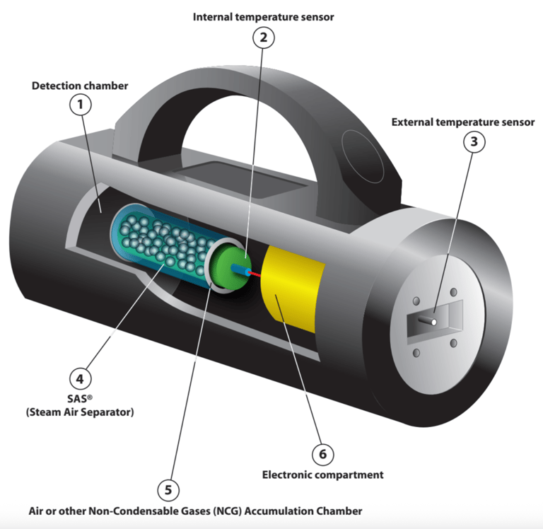 ในห้องตรวจจับ อุปกรณ์ SAS® (4) ทำหน้าที่เหมือนโหลดพรุนที่ช่วยให้ไอน้ำควบแน่น ของเหลวที่ควบแน่นจะถูกกำจัดออกโดยแรงโน้มถ่วง ทำให้อากาศหรือ NCG อื่นๆ แทรกซึมไปยังส่วนหลังของห้องตรวจจับ (เซ็นเซอร์อุณหภูมิภายใน) การปรากฏตัวของอากาศหรือ NCG จะถูกขยาย ทำให้ความสามารถในการตรวจจับเพิ่มขึ้น